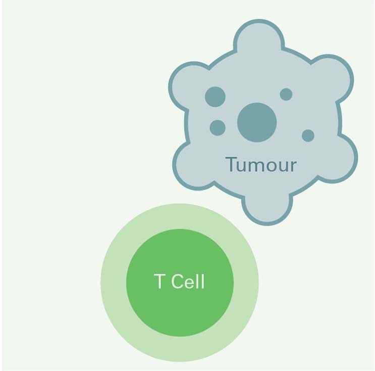 När immunförsvaret fungerar som det ska, aktiveras T-celler och kan attackera tumörceller.3