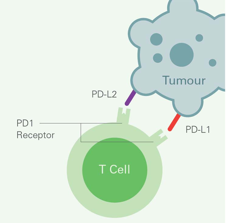 En del tumörer kan dock kringgå immunförsvaret genom signaleringsvägen programmerad celldöd (PD). På dessa tumörcellers yta återfinns ligander, PD-L1 respektive PD-L2 vilka binder till PD-1-receptorer på T-celler. Genom denna mekanism inaktiveras T-cellernas antitumorala förmåga, och tumörcellerna kan undgå immunförsvaret.3