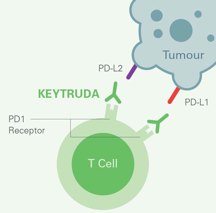 Verkningsmekanismen bakom KEYTRUDA, en monoklonal antikropp, sker genom att PD-1-receptorer på T-cellerna blockeras så att varken PD-L1 eller PD-L2 kan binda in. Då möjliggörs en reaktivering av de tumörspecifika cytotoxiska T-cellerna i tumörens mikromiljö och immunförsvaret återfår sin antitumorala förmåga.2,3