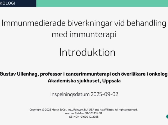 KEYTRUDA Inspelade webbinar om hantering av immunmedierade biverkningar MSD Onkologi har under september 2025 anordnat en webbinarserie som avhandlat hantering av immunmedierade biverkningar som kan uppstå i samband med immunterapibehandling.