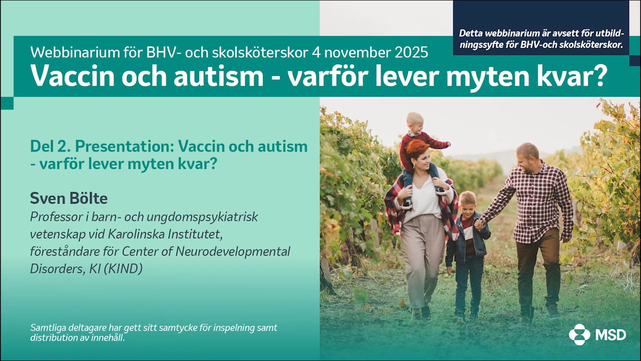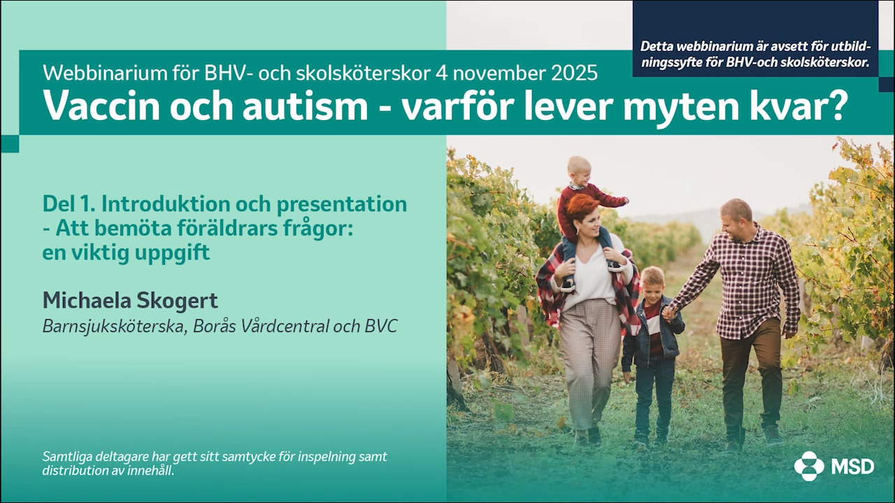 Som leverantör av bland annat MPR-vaccin har MSD uppmärksammat att frågor om kopplingen mellan vaccin och autism fortfarande förekommer. Genom detta inspelade webbinarium från 4 nov 2025 vill vi stärka er kunskap för att bemöta eventuella frågor och funderingar från föräldrar.
