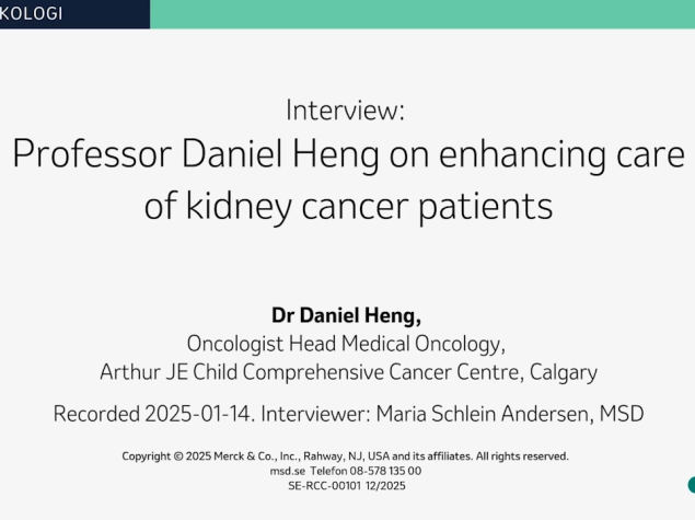 On-demand webbinarium 30:24 Hur väljer man rätt behandling till rätt patient, i rätt ordning? Dr Daniel Heng vägleder I detta State of the art webinar som sändes från Sahlgrenska Universitetssjukhuset vägleder Dr Daniel Heng inom det komplexa behandlingslandskapet vid avancerad njurcancer. Dr Heng är känd bl a som grundaren av IMDC, International Metastatic RCC Database Consortium.
